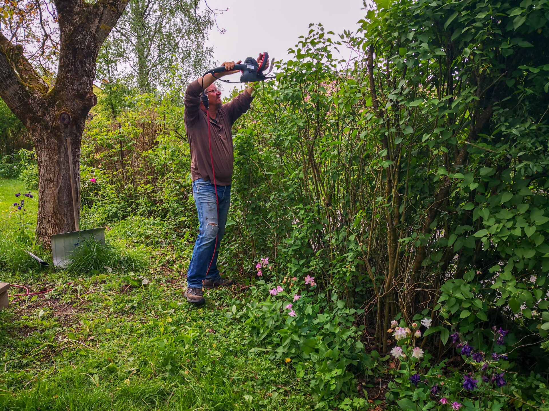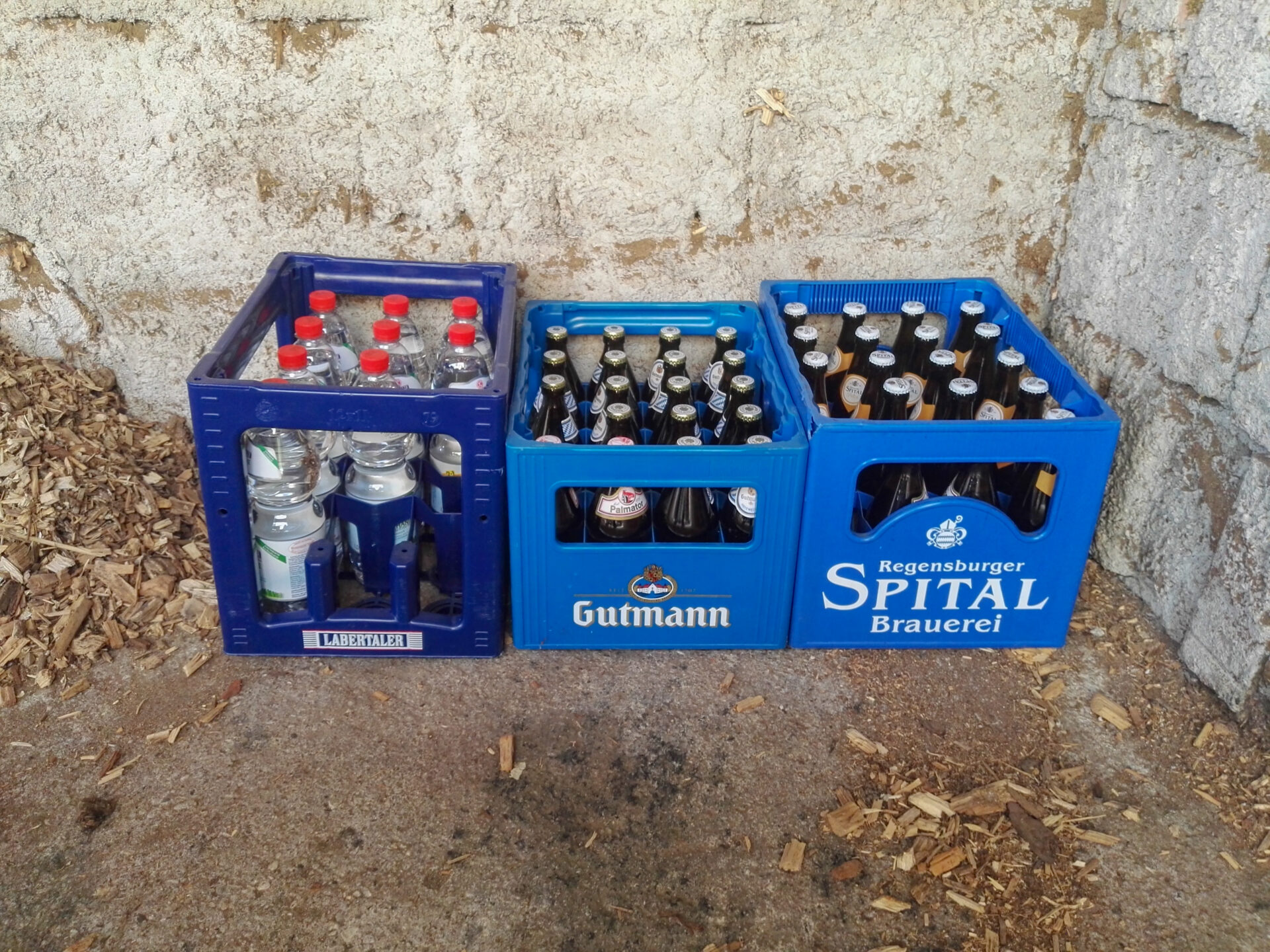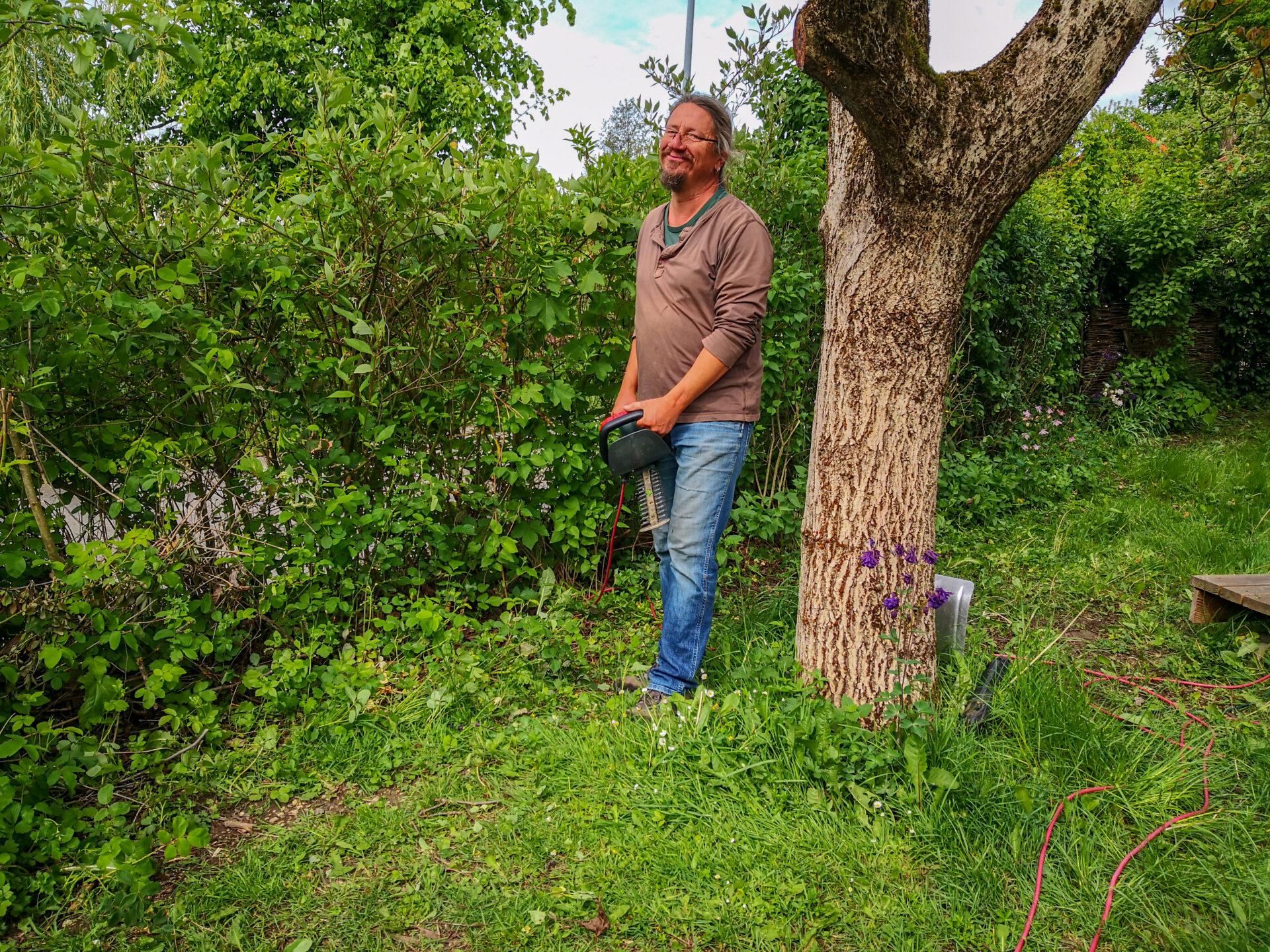 Damit uns nicht langweilig wird, bekommen wir von Hans sinnvolle Beschäftigung. Holz spalten und Hecke schneiden sind sehr meditativ! Alma genießt den Auslauf und hat ihre erste Begegnung mit einem angriffslustigen Roboterrasenmäher! Und einen dicken Igel können wir auch noch aus einer Fuchsfalle retten. Für’s leibliche Wohl ist auch gesorgt: Je ein Kasten leckeres Helles und Weizen werden uns von einem edlen Spender frei Haus geliefert! Dazu noch Weißwürste, Brezn und den guten Händlmaiersenf! Was will man mehr. Sehr fein! Vielen Dank!