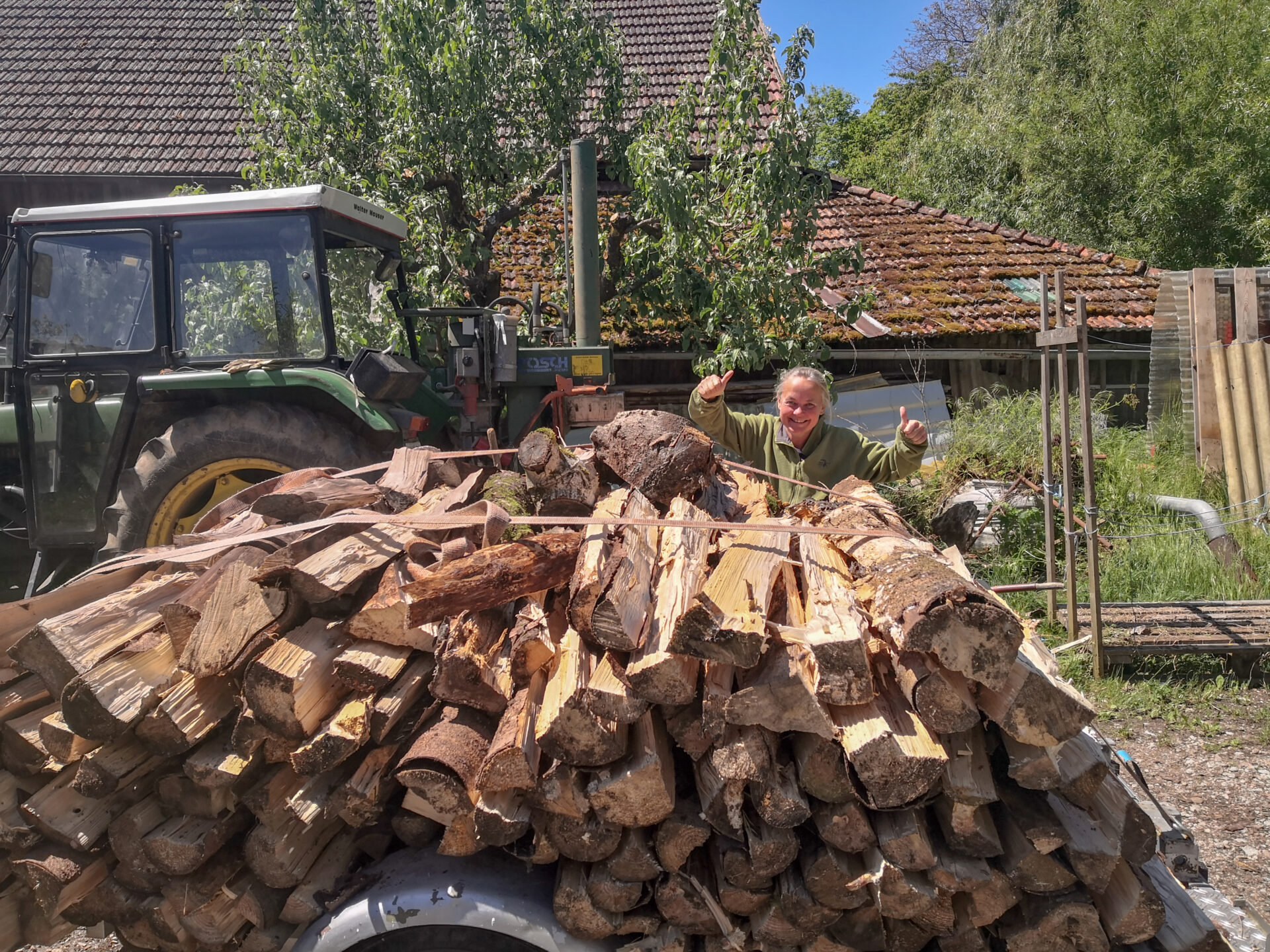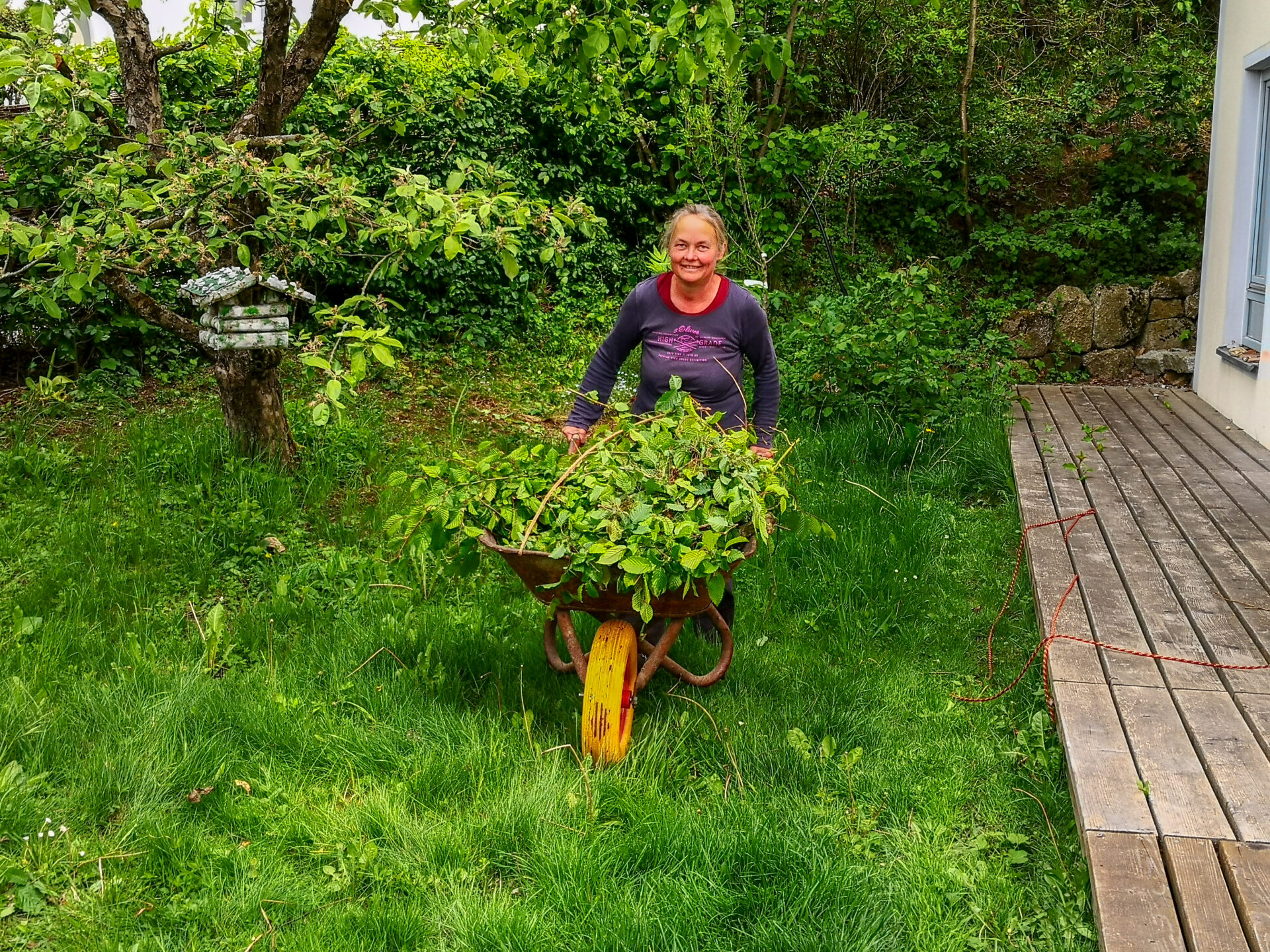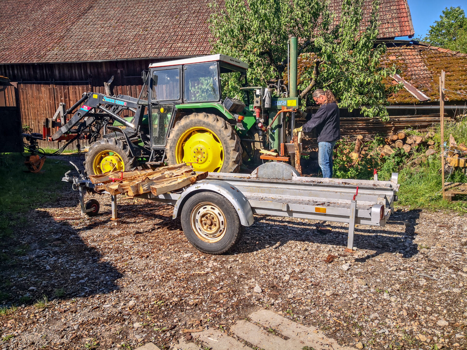 Damit uns nicht langweilig wird, bekommen wir von Hans sinnvolle Beschäftigung. Holz spalten und Hecke schneiden sind sehr meditativ! Alma genießt den Auslauf und hat ihre erste Begegnung mit einem angriffslustigen Roboterrasenmäher! Und einen dicken Igel können wir auch noch aus einer Fuchsfalle retten. Für’s leibliche Wohl ist auch gesorgt: Je ein Kasten leckeres Helles und Weizen werden uns von einem edlen Spender frei Haus geliefert! Dazu noch Weißwürste, Brezn und den guten Händlmaiersenf! Was will man mehr. Sehr fein! Vielen Dank!